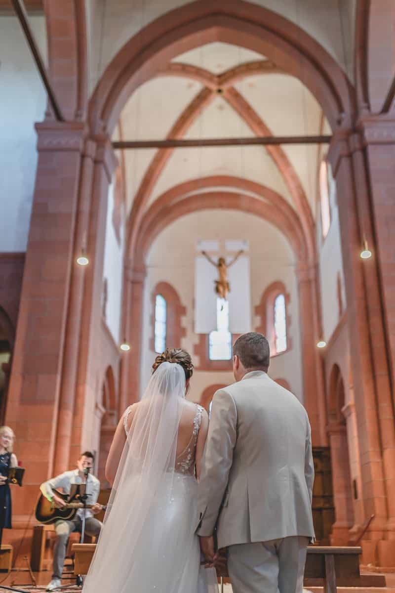 Die kirchliche Trauung fand in der katholischen St. Peter Kirche in Bruchsal statt. Die katholische Kirche St. Peter in Bruchsal ist sehr prunkvoll und trotzdem sehr stilvoll. Eine herzliche Trauung mit großer persönlicher Note schuf eine emotionsgeladene Atmosphäre. Familienmitglieder brachten Reden und musikalische Stücke beeindruckend mit ein.